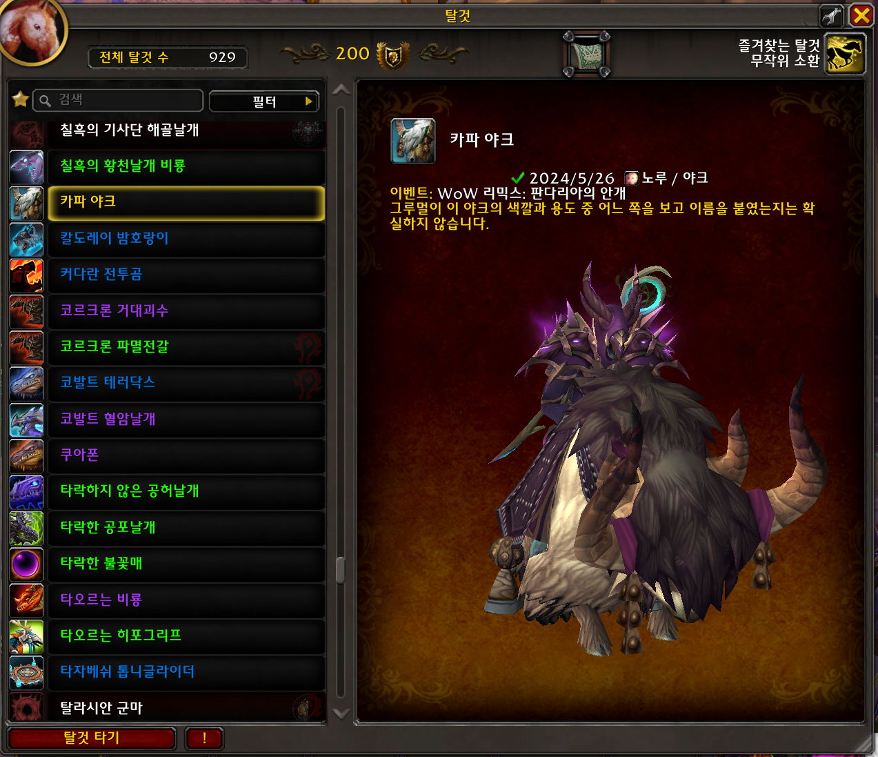 길들인 검은색 야크/수수한 원정용 야크/카파 야크 탈것은 판다리아 리믹스에서 획득하는 탈것입니다.