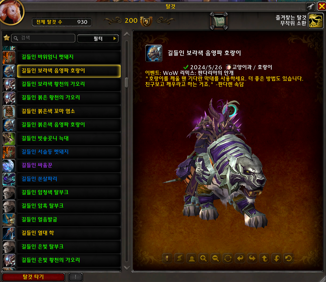 2024.05.26 길들인 보라색 음영파 호랑이 획득 930번째 탈것