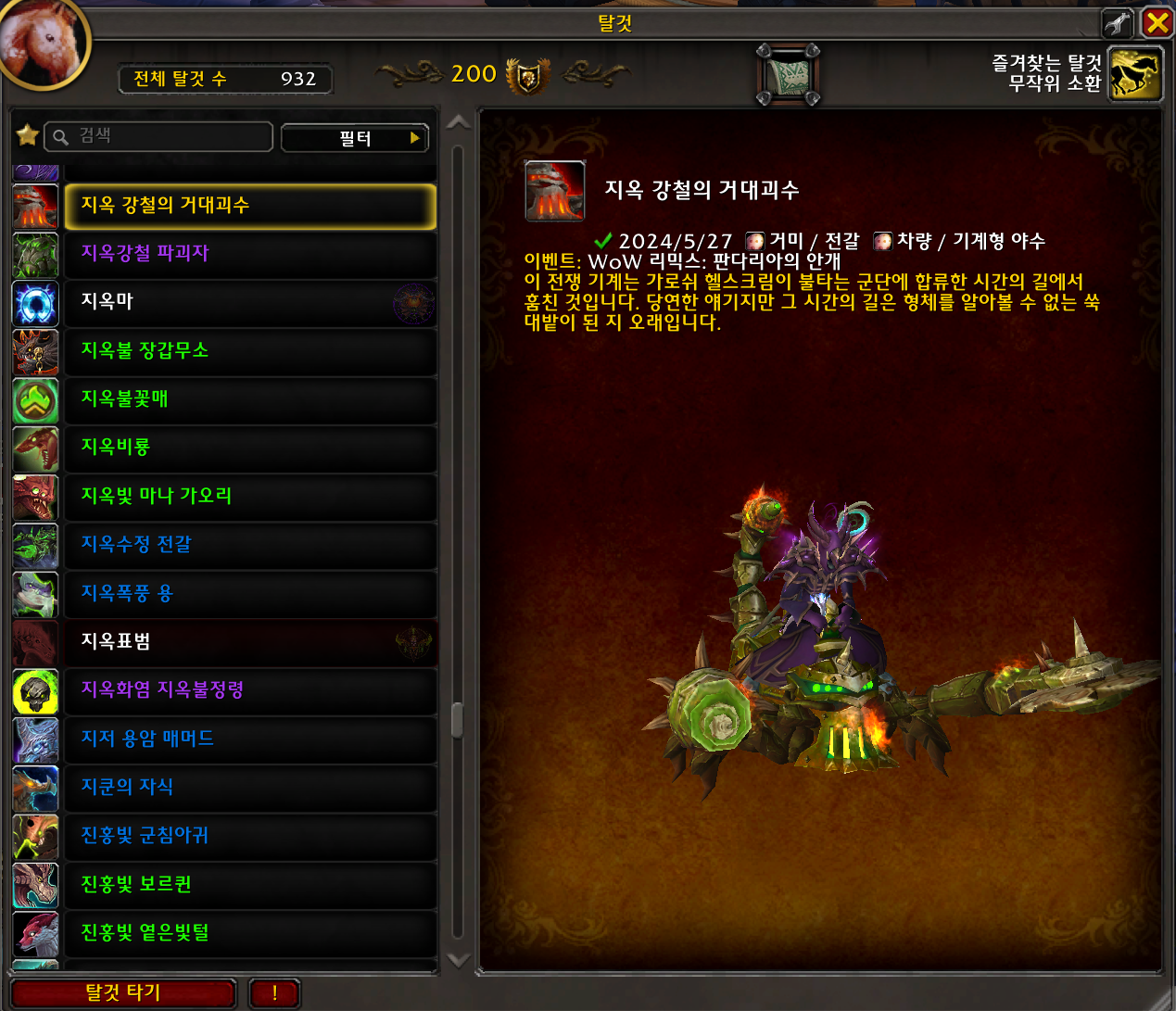 2024.05.27 지옥 강철의 거대거수 획득 931번째 탈것