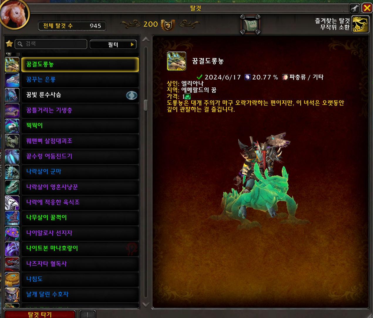 2024.06.17 꿈결도롱뇽 획득 945번째 탈것