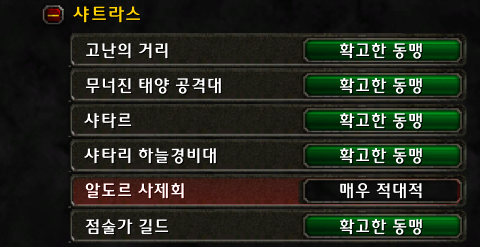 점술가 길드 / 알도르 사제회는 불타는성전지역 평판으로 샤트라스 지역 평판입니다. 먼저 점술가 길드와 알도르 사제회는 서로 반대되는 평판입니다. 둘중 한가지만 선택해서 올릴수 있고 점