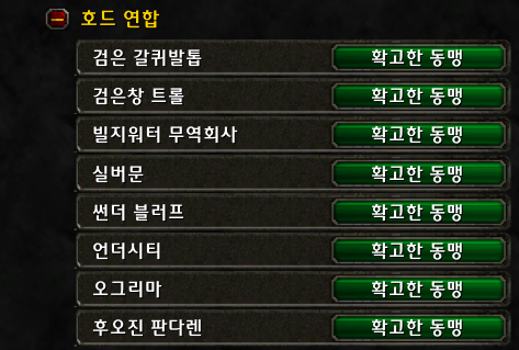 호드 연합(검은창 트롤 / 빌지워터 무역회사 / 실버문 / 썬더 블러프 / 언더시티 / 오그리마 / 후오진 판다렌)