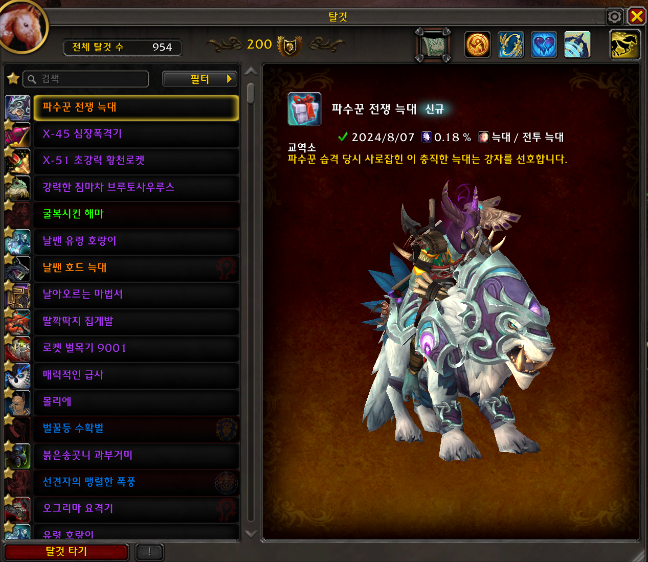 2024.08.07 파수꾼 전쟁 늑대 획득 954번째 탈것