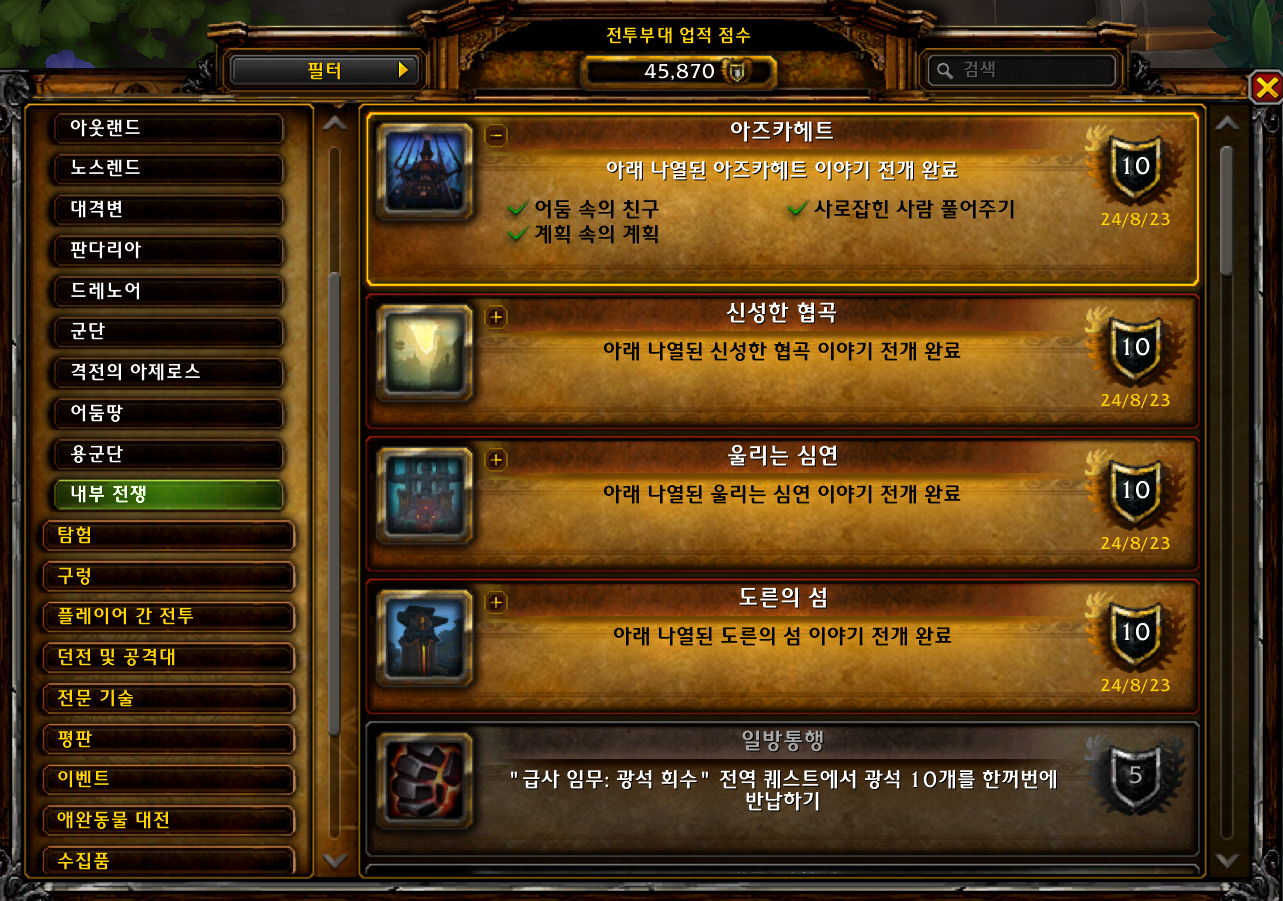 아즈카헤트 업적은 내부 전쟁 확장팩 업적으로 내부 전쟁 4번째지역 현자입니다.