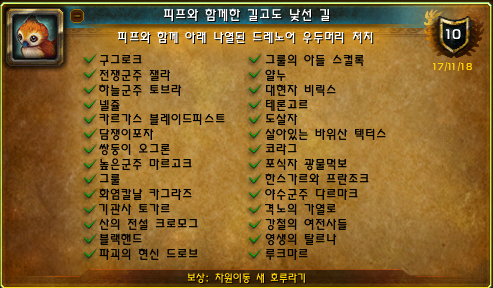 해당업적은 피프를 소환하여 피프와 같이 업적에 나열되어있는 몬스터를 처치하는 업적입니다. 몬스터는 전부 드레노어에있는 우두머리들 입니다.