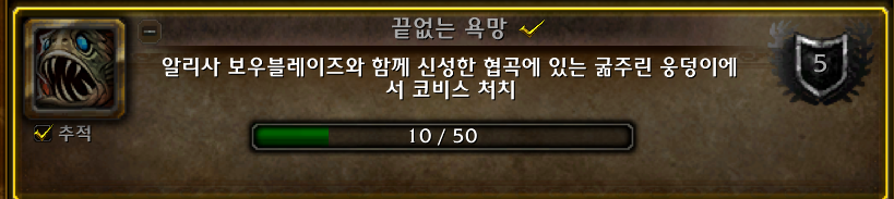끝없는 욕망 업적은 내부전쟁 확장팩 업적으로 알리사 보우블레이즈와 코비스 50마리를 처치하는 업적입니다.
