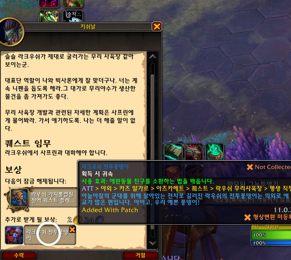 라크우쉬 전투풍뎅이 애완동물은 내부전쟁 확장팩 애완동물로 아즈카헤트 지역 퀘스트 보상입니다.