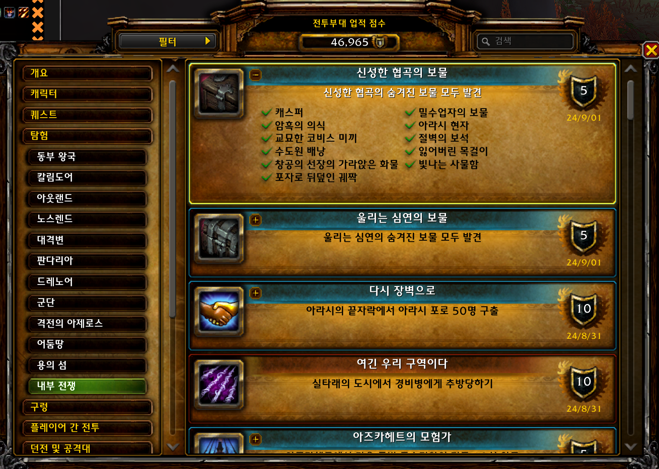 신성한 협곡의 보물 업적은 내부전쟁 확장팩 업적으로 신성한 협곡에 있는 보물 11개를 찾는 업적입니다.