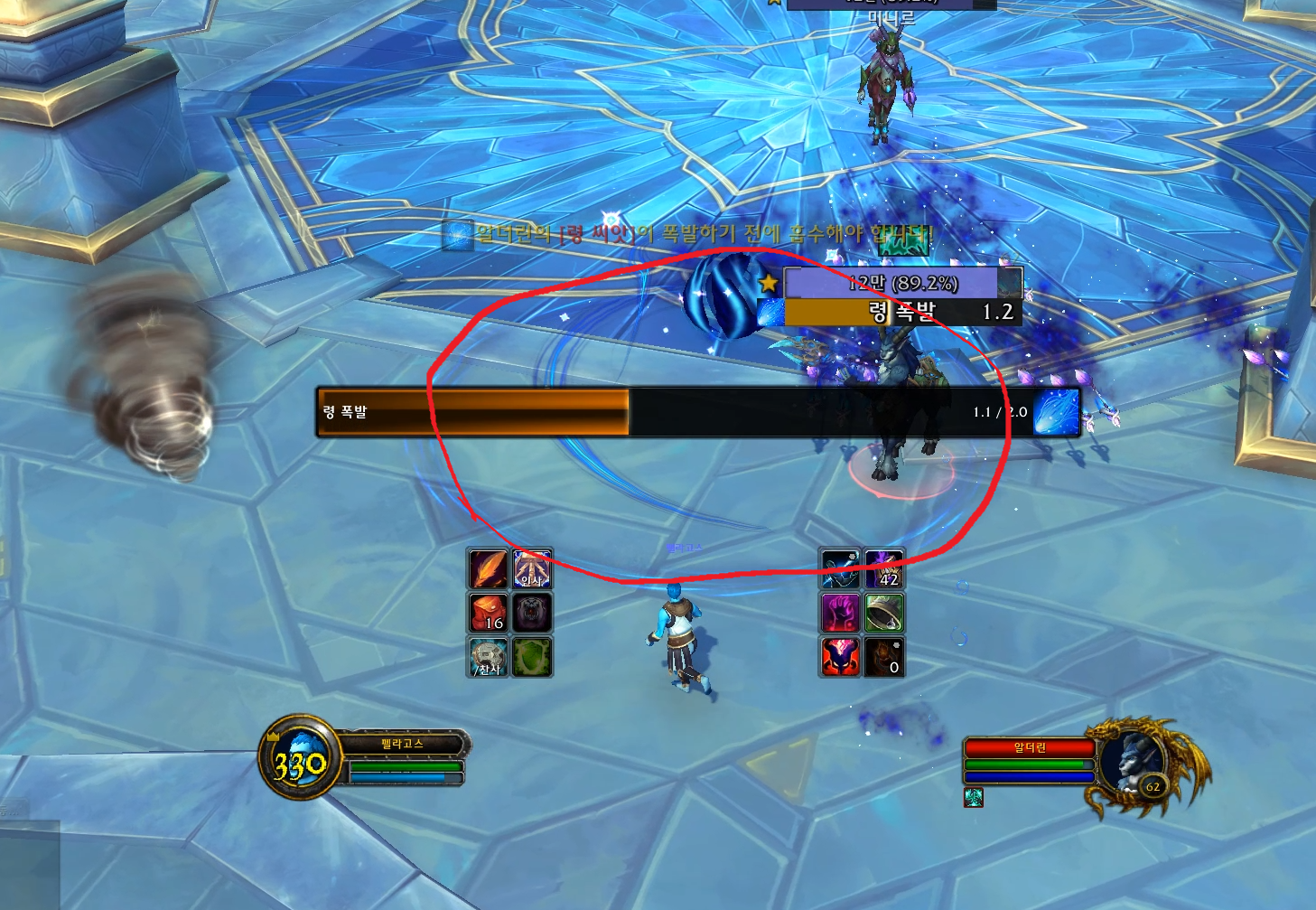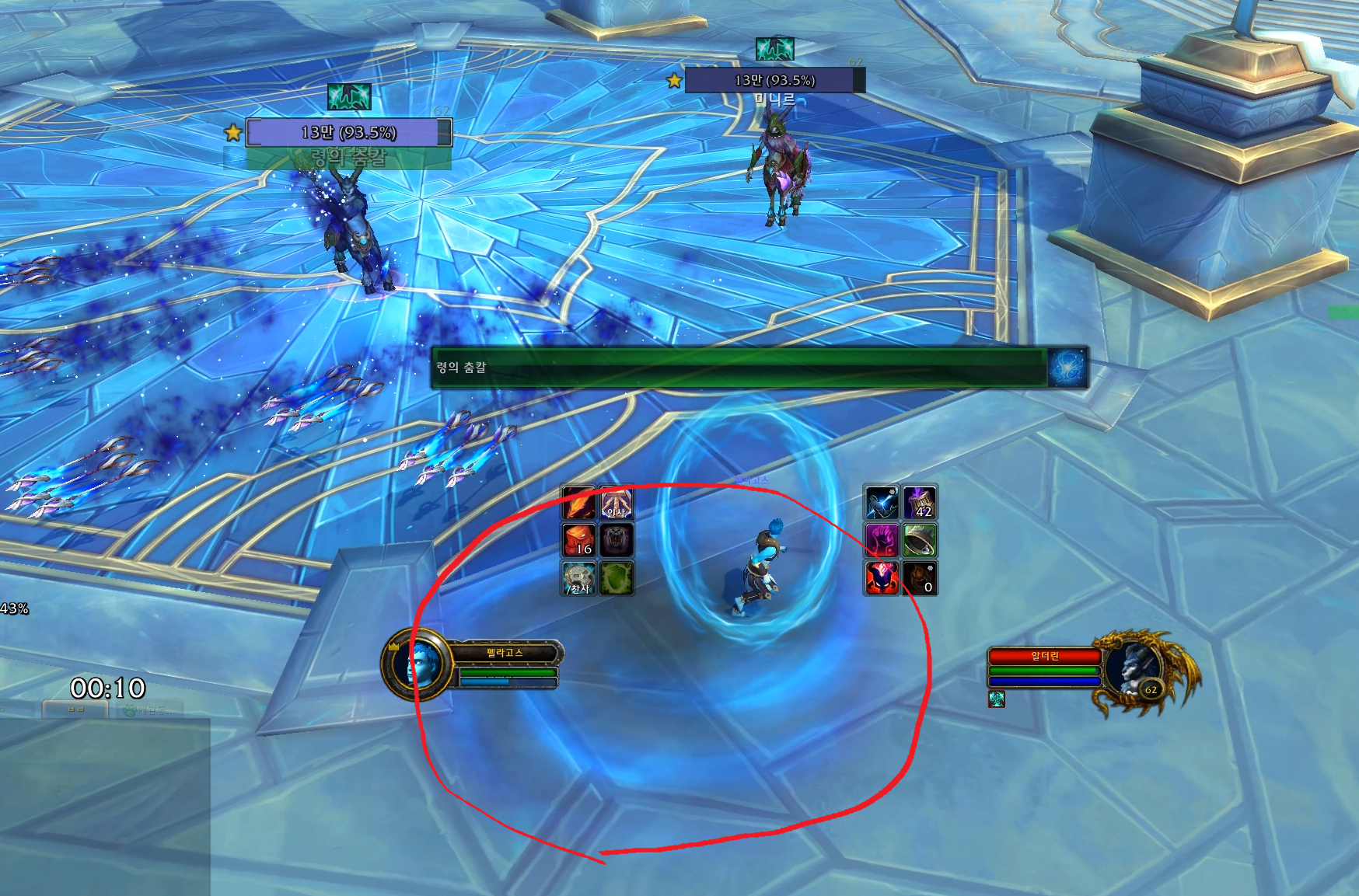 미니르가 쓰는 화살과 알더린이 쓰는 파란색 바닥을 피하면서 딜해서 잡으면 됩니다.