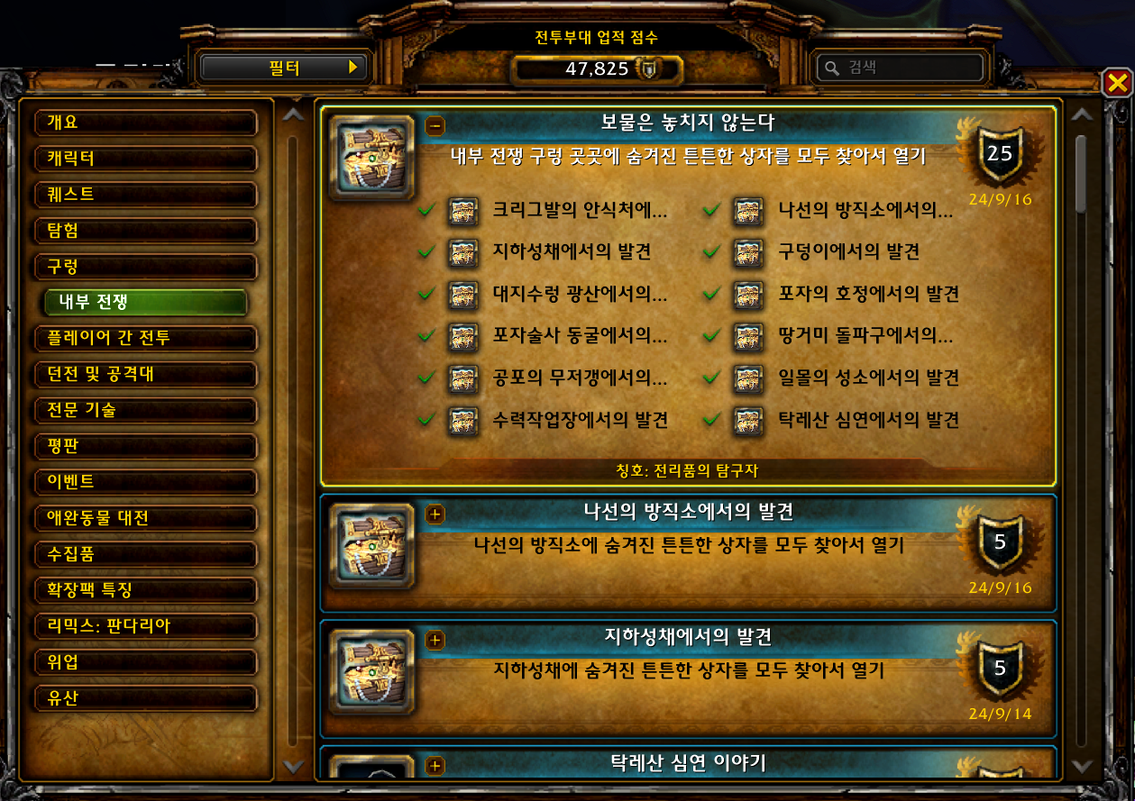 보물은 놓치지 않는다 업적은 내부전쟁 확장팩 업적으로 12개 구렁에서 튼튼한 상자를 전부다 먹는 업적입니다.