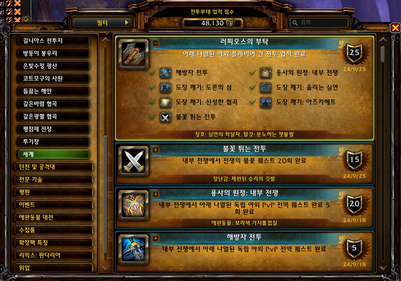 2024.09.18 용사의 원정: 내부 전쟁 획득 20점짜리 47900점 용사의 원정: 내부 전쟁 업적은 내부전쟁 확장팩 업적으로 8개의 pvp전역퀘를 5번씩 완료하는 업적입니다. [와우업적]해방자 전투2024.09.18