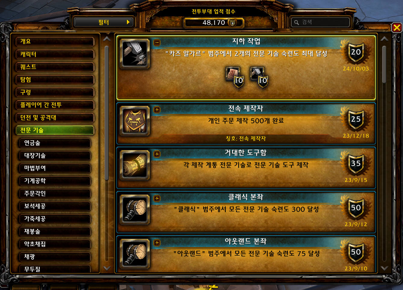 지하 작업 업적은 내부전쟁 확장팩 업적으로 2개의 전문기술을 숙련도 100찍는 업적입니다.