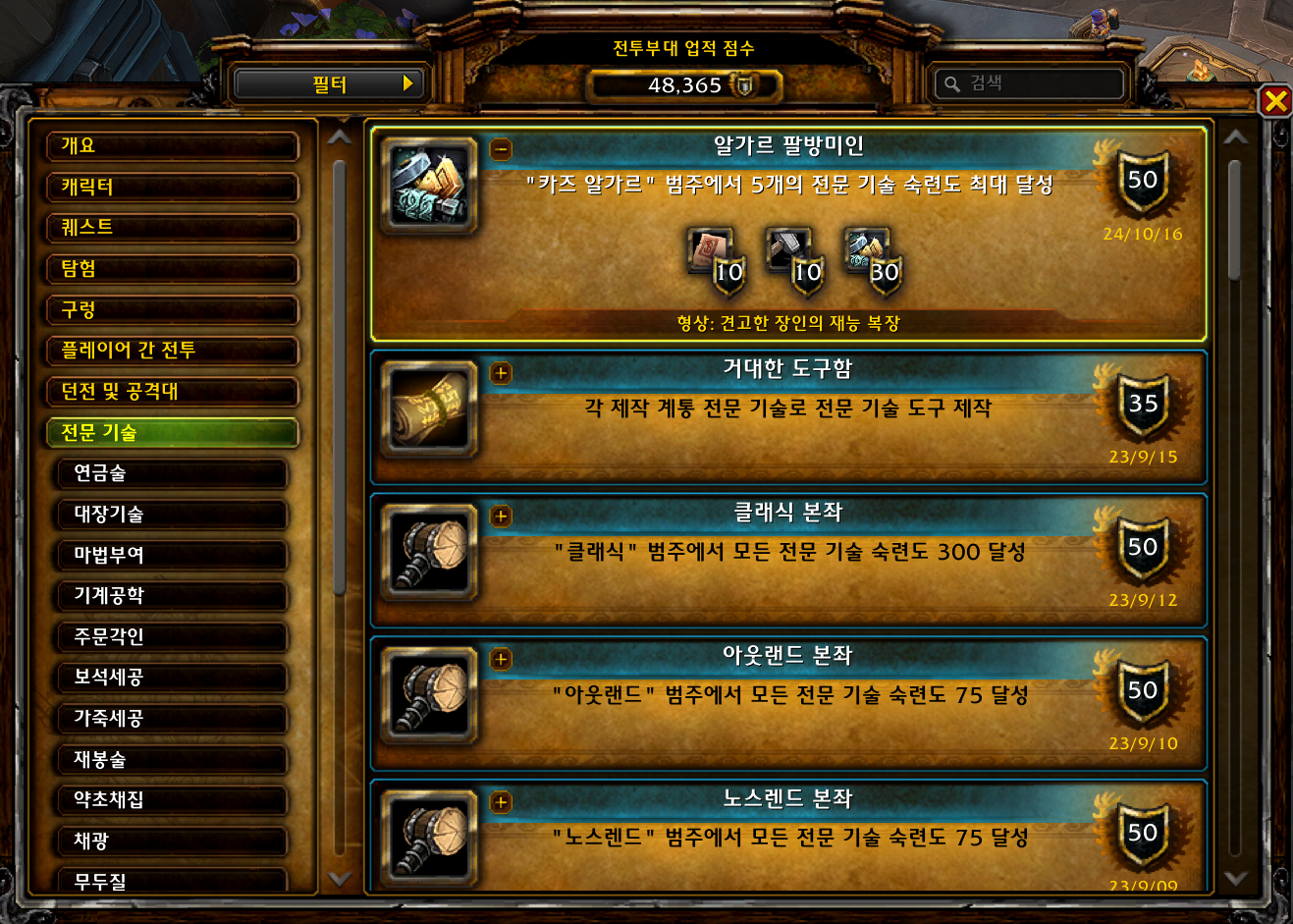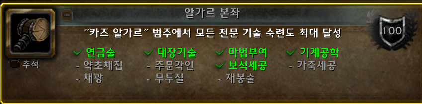 알가르 팔방미인 업적은 내부전쟁 확장팩 업적으로 5개 전물기술 숙련도 100을 만드는 업적입니다.