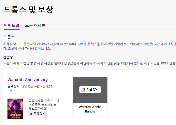 오늘부터 12월 12일 전까지 트위치에 들어가서 드롭스 방송을 보면 들어옵니다.