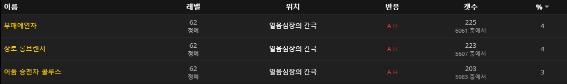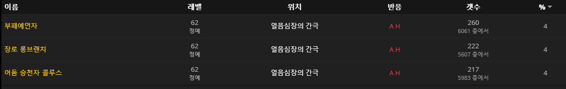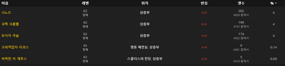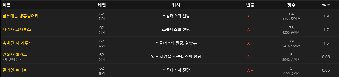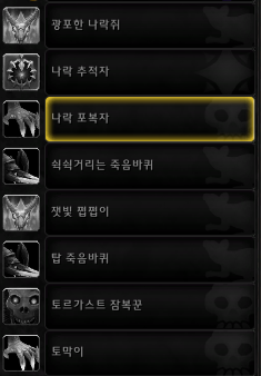 광포한 나락쥐 / 나락 추적자 / 나락 포복자 / 쉭쉭거리는 죽음바퀴 / 잿빛 쩝쩝이 / 탑 죽음바퀴 / 토르가스트 잠복꾼 / 토막이