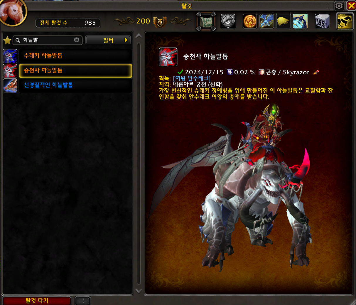 2024.12.15 승천자 하늘발톱 획득 985번째 탈것