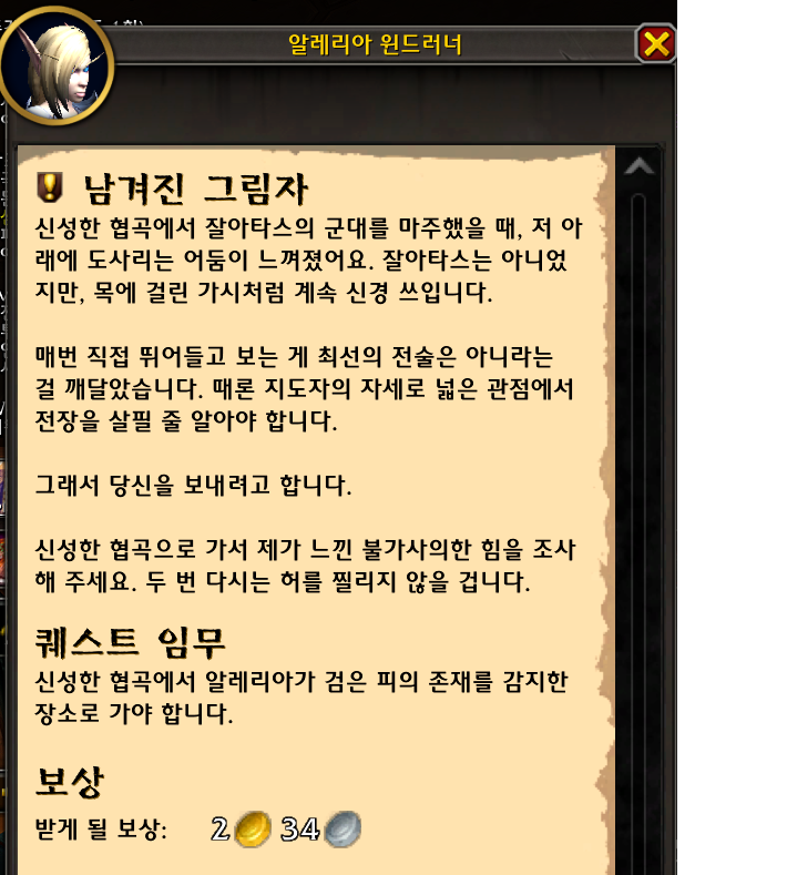오늘 접속하면 노르노갈에 알레리아 윈드러너가 남겨진 그림자 퀘스트를 줍니다.