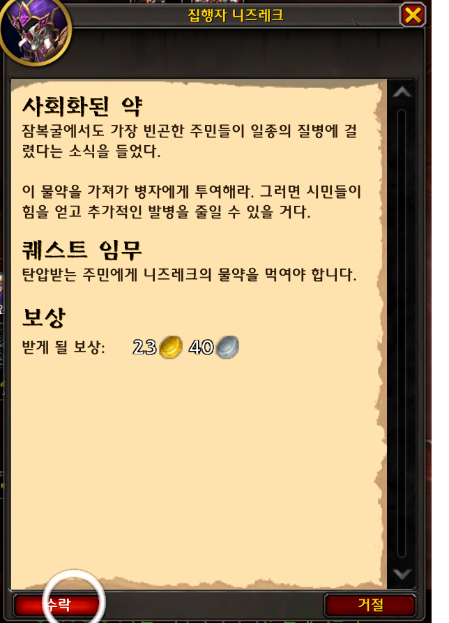 시작퀘 위치는 실타래의 도시 /way 52.73 46.07에서 집행자 니즈레크가 주는 퀘스트입니다.
