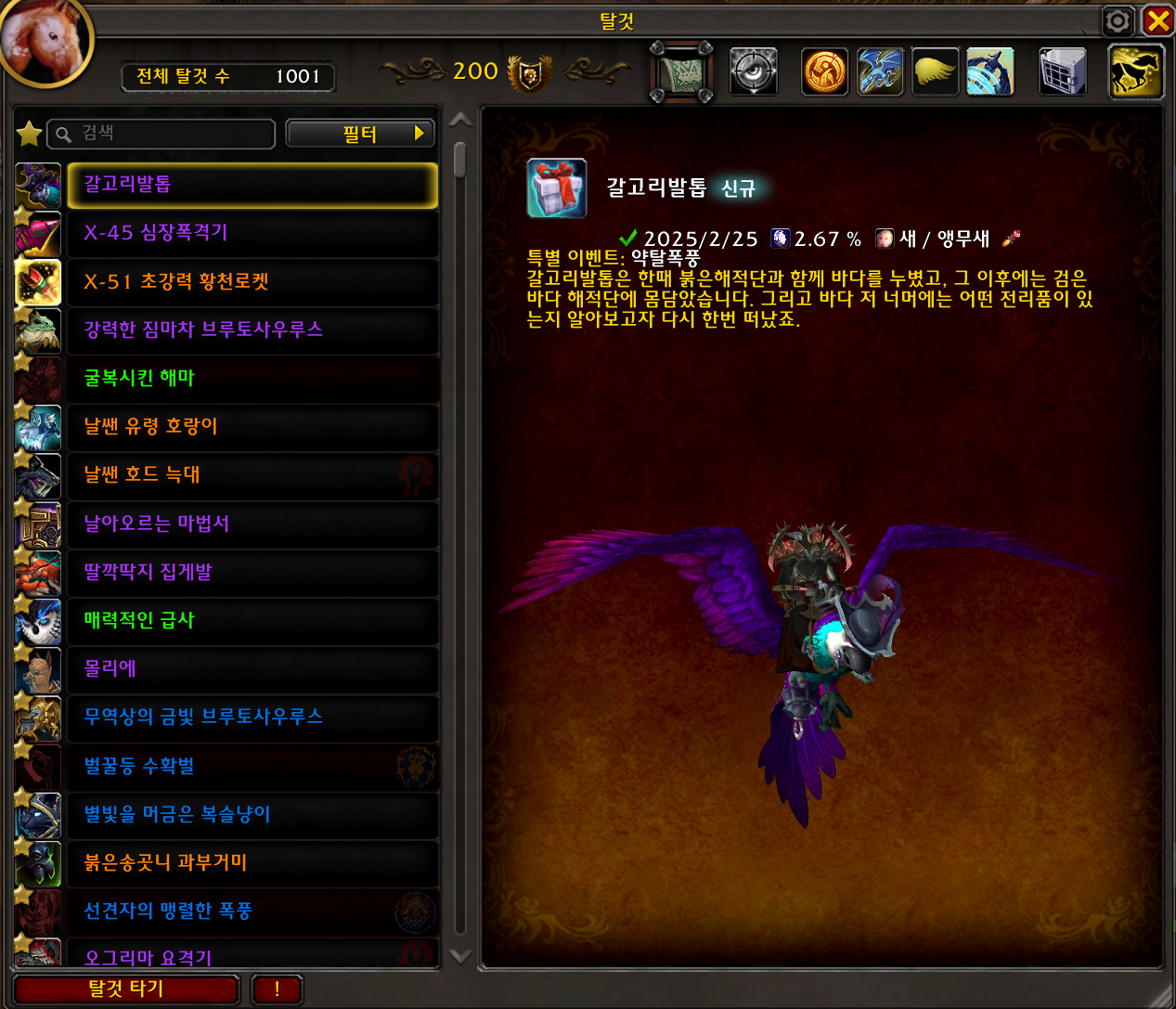 2025.02.25 갈고리발톱 획득 1001번째 탈것