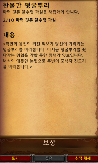 3일차 퀘스트입니다. 마력 깃든 끝수렁 과실 10개를 모아와야 합니다.