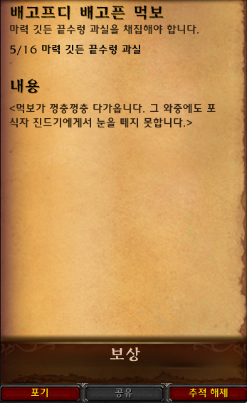 마지막 퀘스트인 예상 밖의 세계포식자를 잡으면 충직한 먹보 탈것을 줍니다.