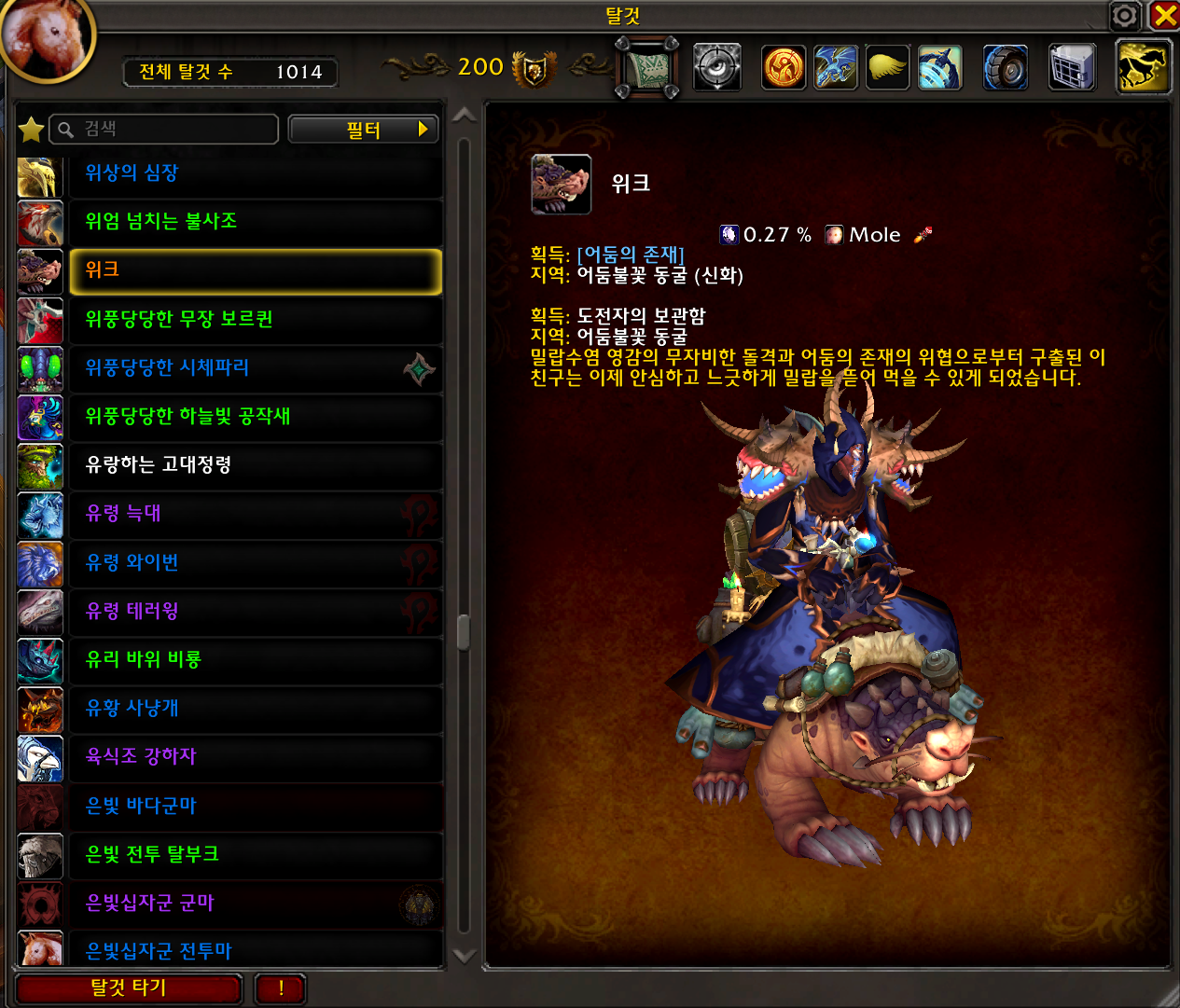 위크 탈것은 내부전쟁 확장팩 탈것으로 어둠불꽃 동굴 던전에서 획득 가능합니다.