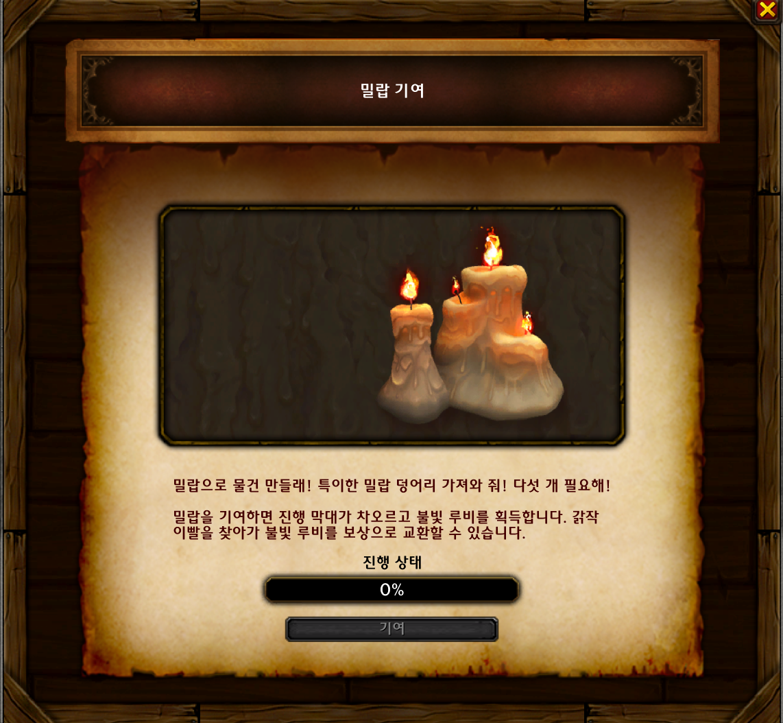 게이지가 100%가 되면 불빛 루비 1개를 줍니다. 특이한 밀랍 덩어리 5개를 반납하면 10%가 찹니다. 즉 특이한 밀랍 덩어리 50개 = 불빛 루베 1개