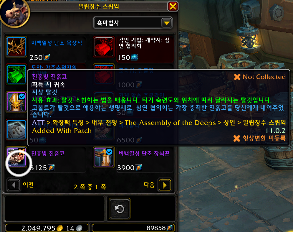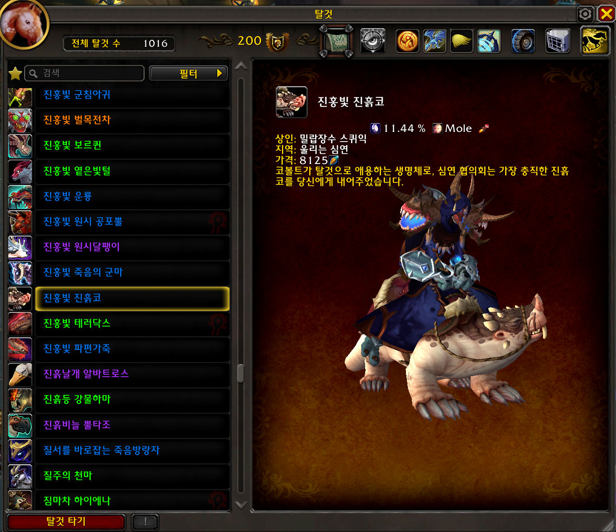 진홍빛 진흙코 탈것은 내부전쟁 확장팩 탈것으로 울리는 심연 밀렵장수 스퀴익에게서 구매합니다.