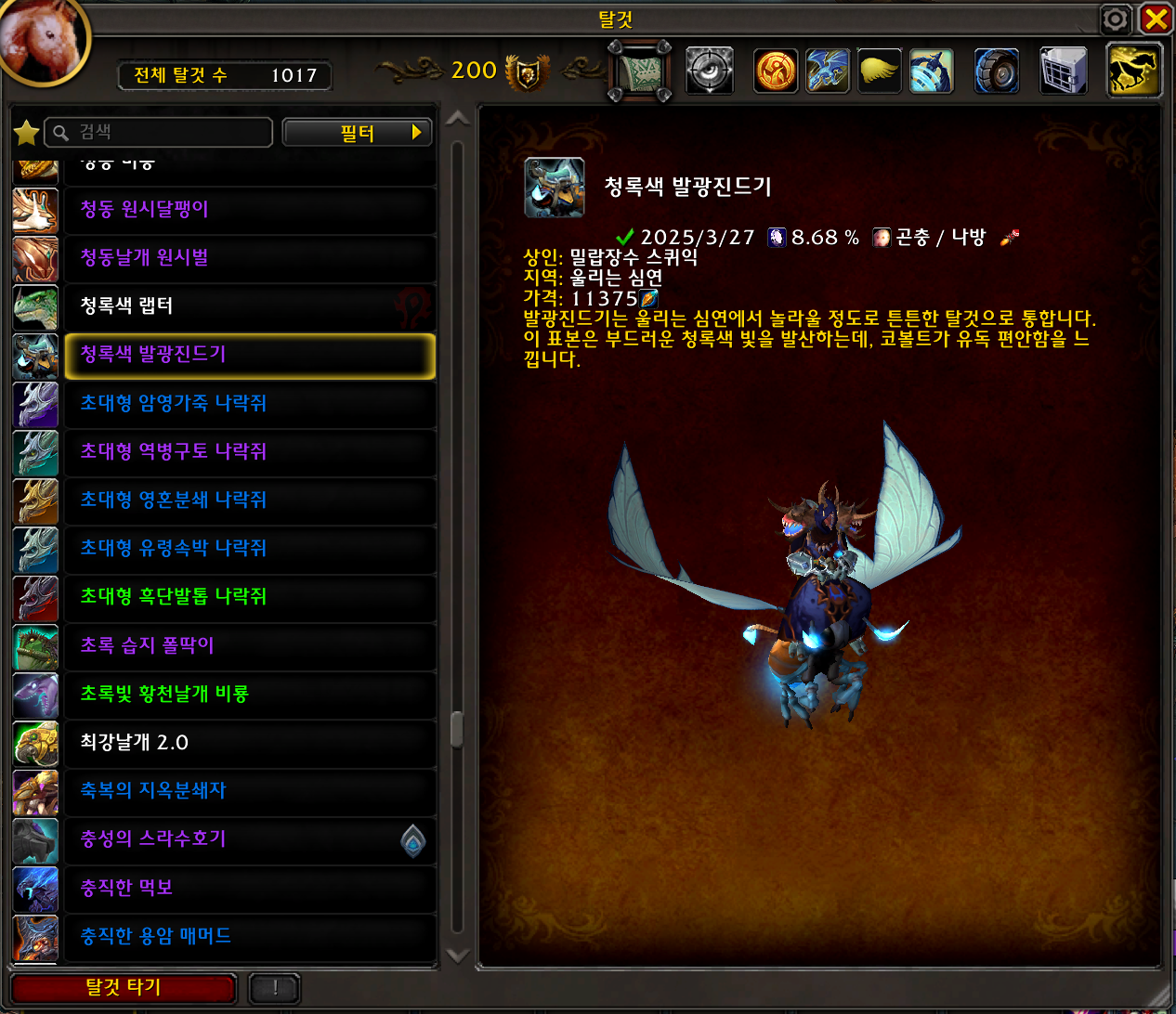 2025.03.27 청록색 발광진드기 획득 1017번째 탈것