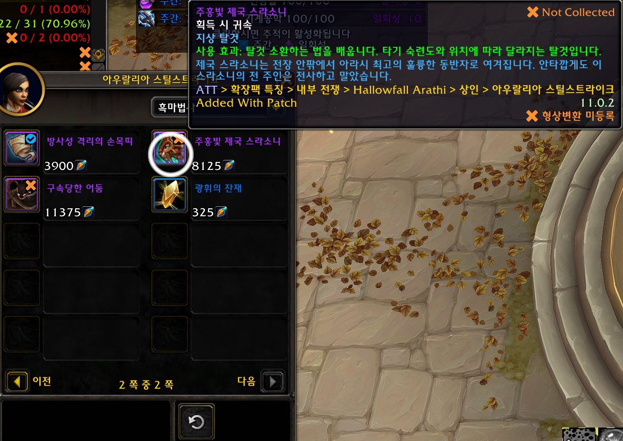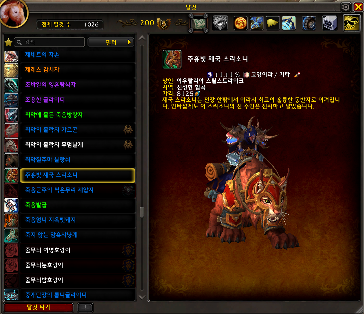 주홍빛 제국 스라소니 탈것은 내부전쟁 확장팩 탈것으로 신성한 협곡 아라시 병참장교에게서 구매가능합니다.
