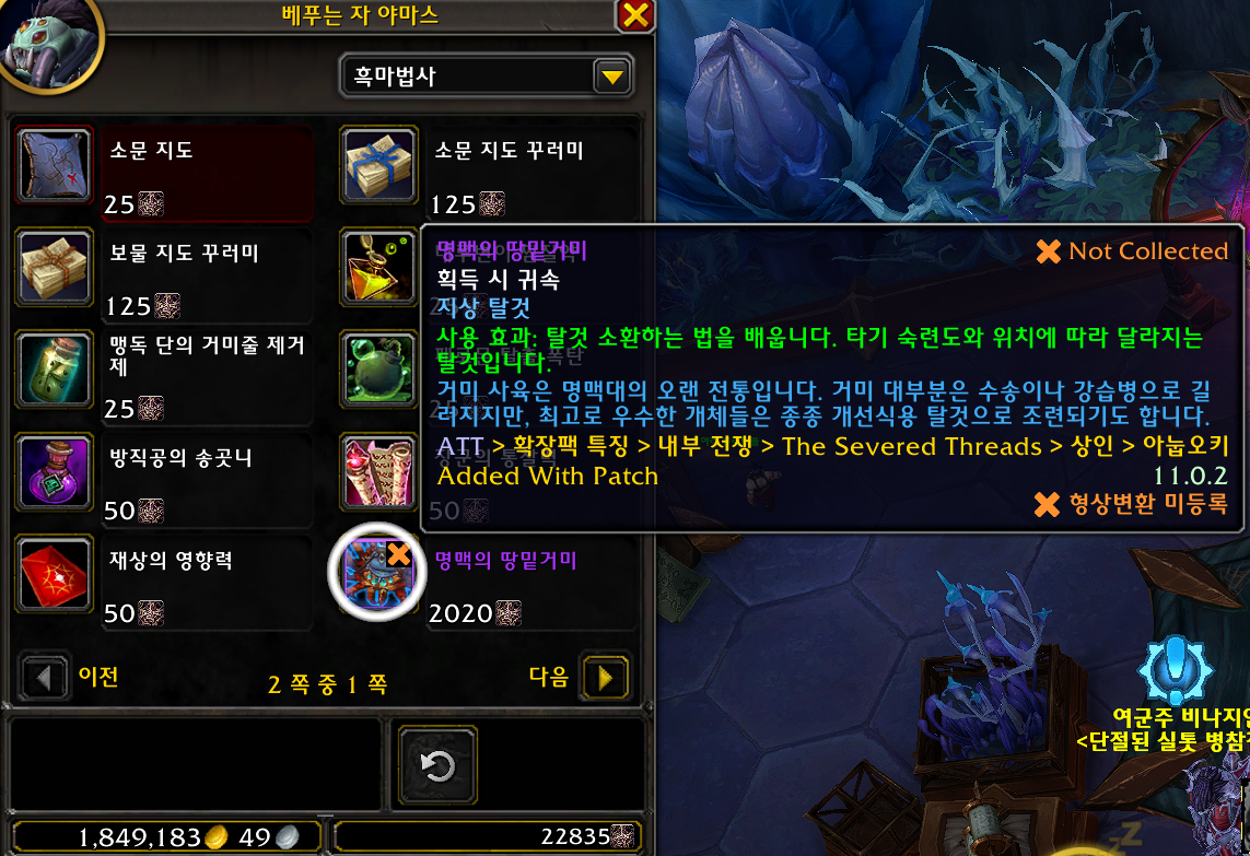 명맥의 땅밑거미 탈것은 내부전쟁 확장팩 탈것으로 아즈카헤트에 있는 베푸는자 야마스가 판매합니다.