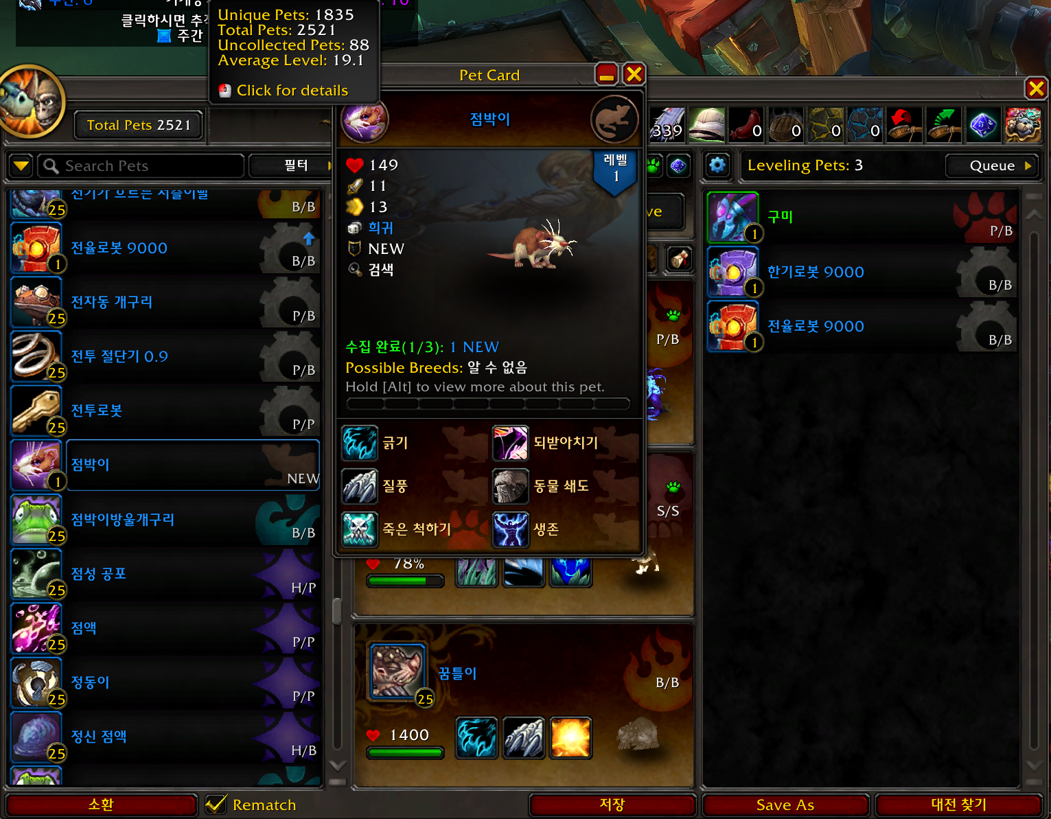 점박이 애완동물은 내부전쟁 확장팩 애완동물로 퀘스트 완료보상입니다.