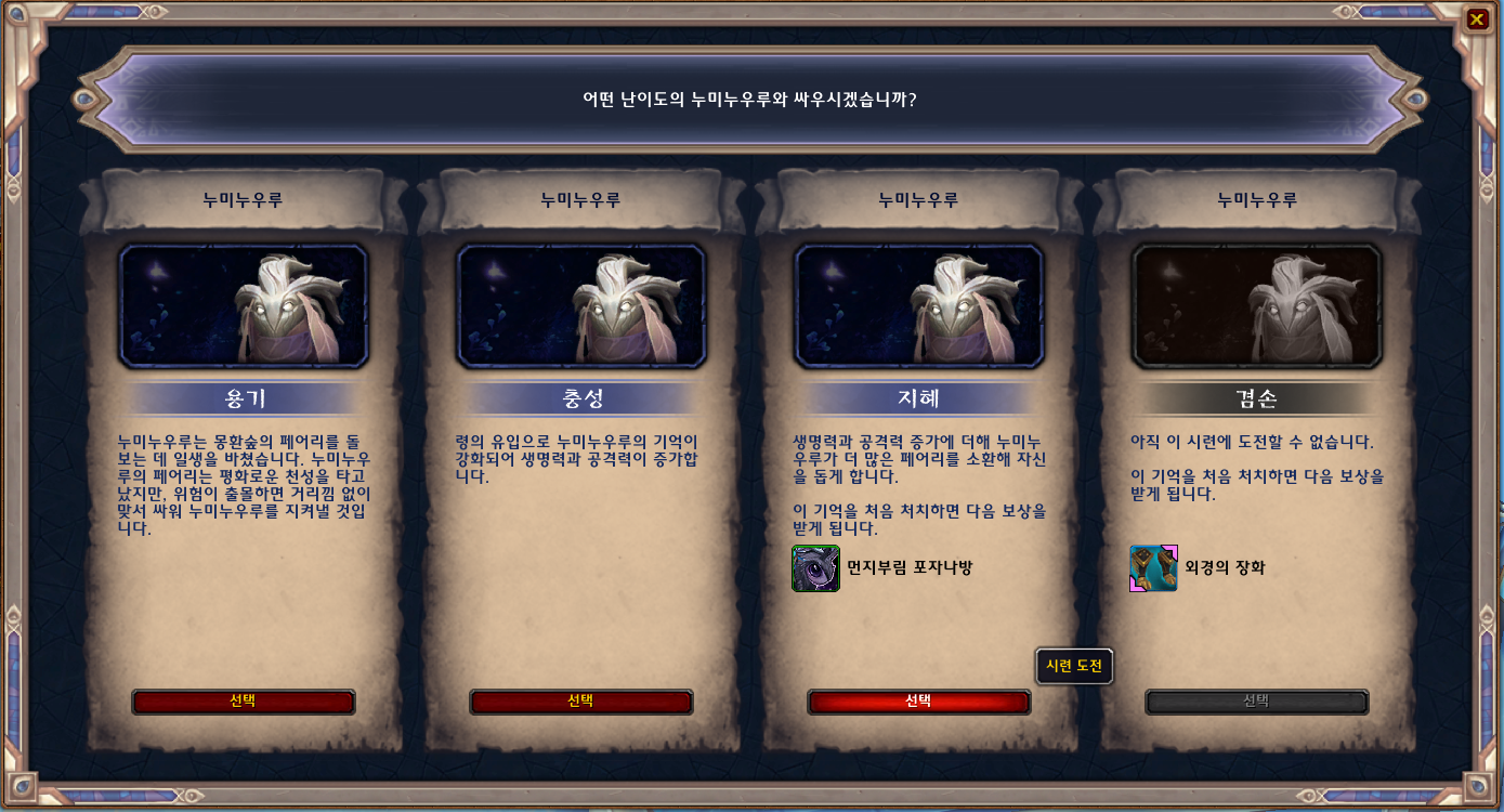 | [와우정보]승천의 길 - 비겁자 코린스 공략(용기/충성/지혜/겸손 난이도) (0) | 2021.02.12 |