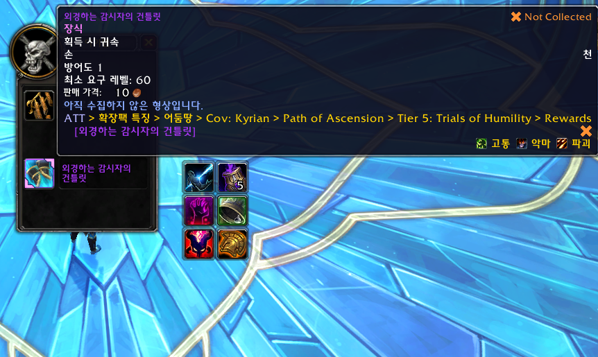 비겁자 코린스 겸손난이도를 클리어하면 외경하는 감시자의 건틀릿 형상을 획득합니다.
