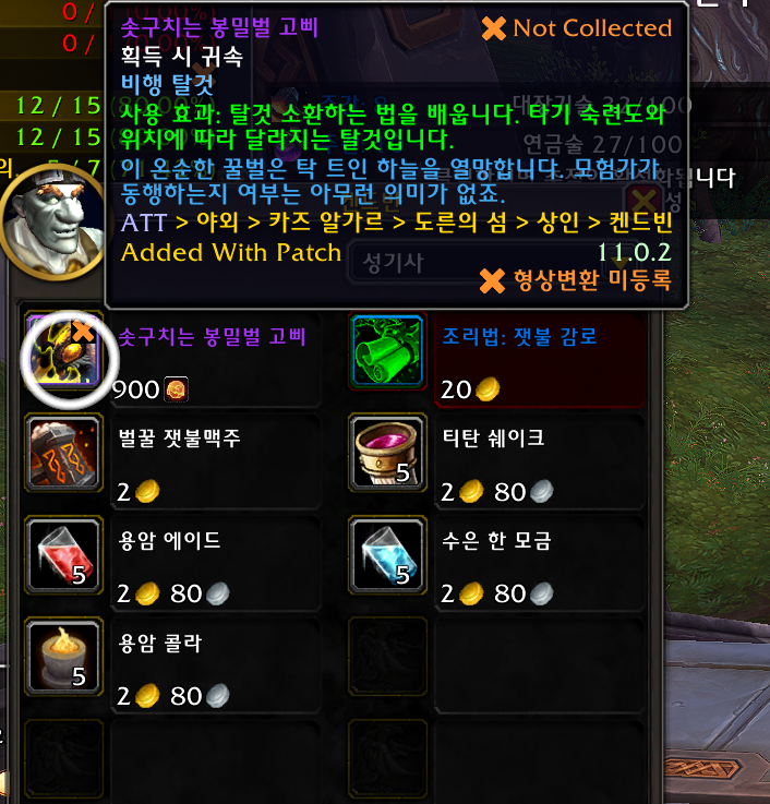 솟구치는 봉밀벌 탈것은 내부전쟁 확장팩 탈것으로 지글거리는 잿불꽃가루 900개로 구매하는 탈것입니다.