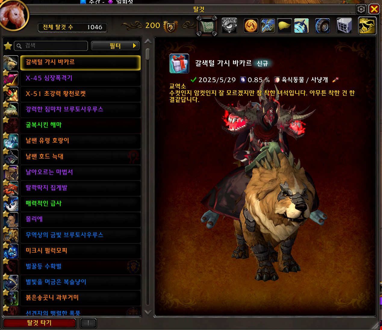 2025.05.29 갈색털 가시 바카르 획득 1046번째 탈것