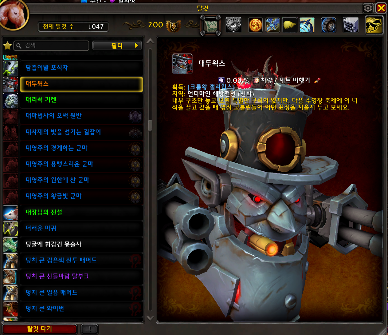 대두윅스 탈것은 내부전쟁 확장팩 탈것으로 2시즌 레이드 막넴 갤리윅스가 드랍합니다.