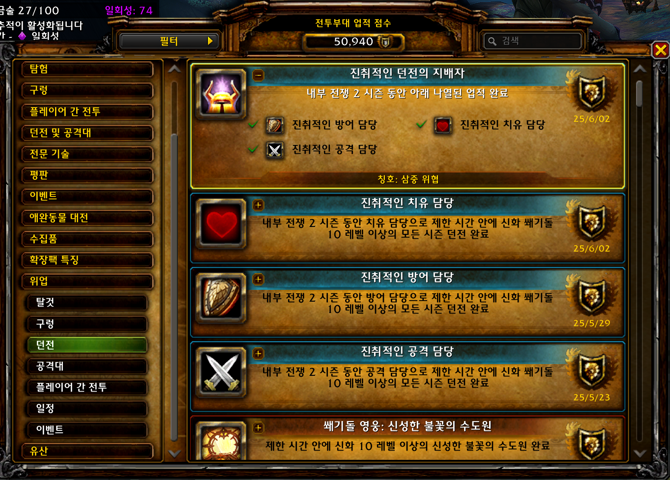 진취적인 던전의 지배자 업적은 내부전쟁 2시즌 업적으로 2시즌에만 획득이 가능합니다.