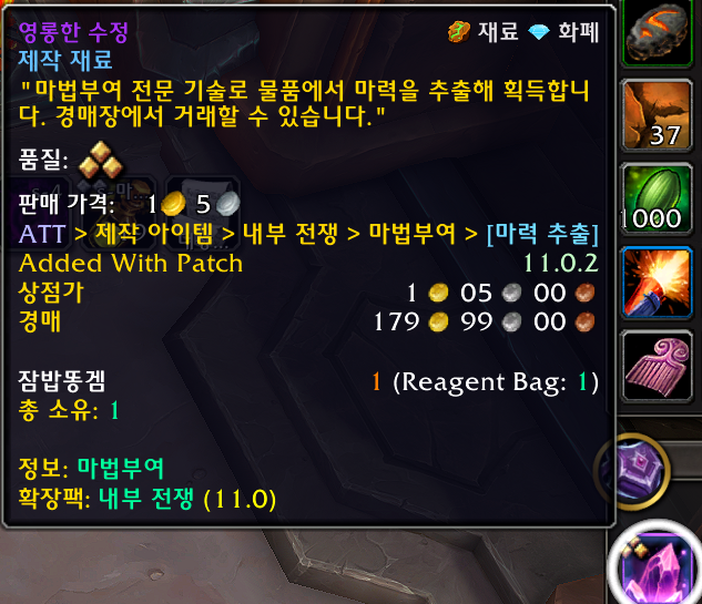 영롱한 수정 3성 1개(보라색템 마력추출하면 나오는 아이템)