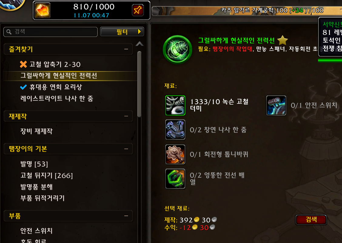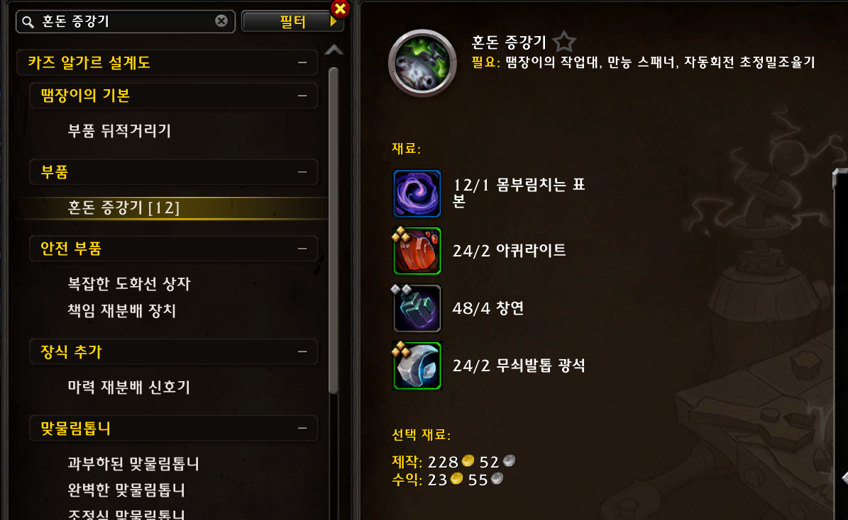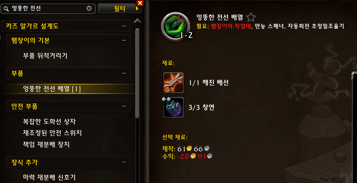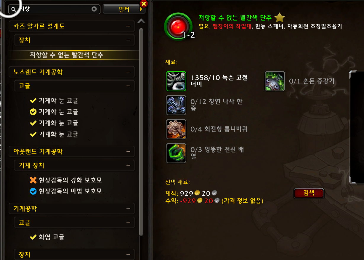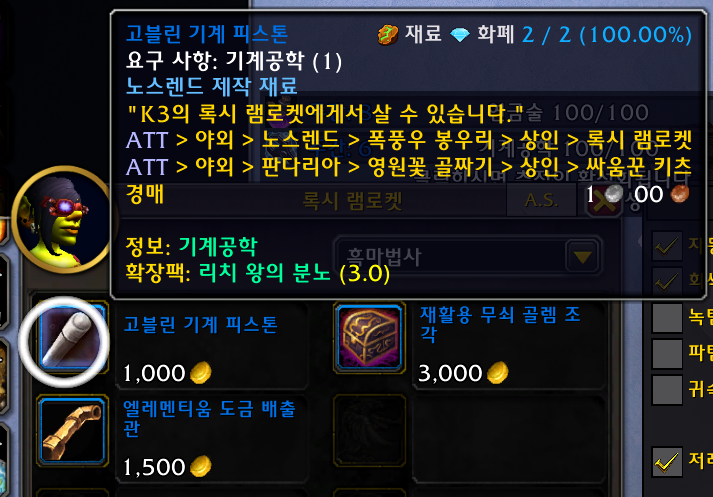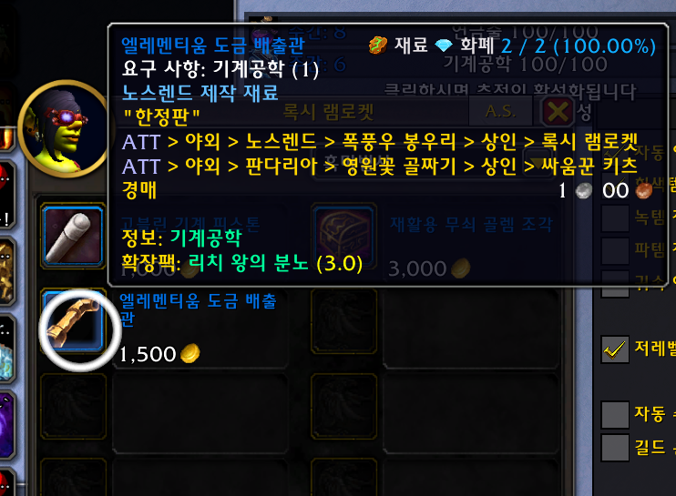록시 램로켓에게서 고블린 기계 피스톤 4개를 구입해서 (살때 엘레멘티움 도금 배출관도 1개 구입해두기)