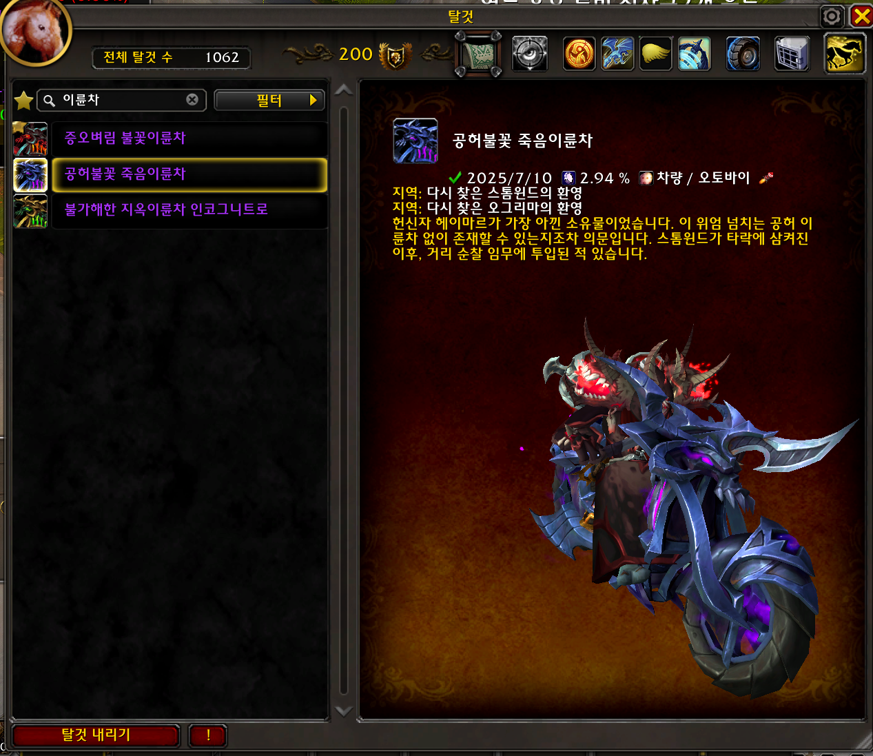 2025.07.10 공허불꽃 죽음이륜차 획득 1062번째 탈것