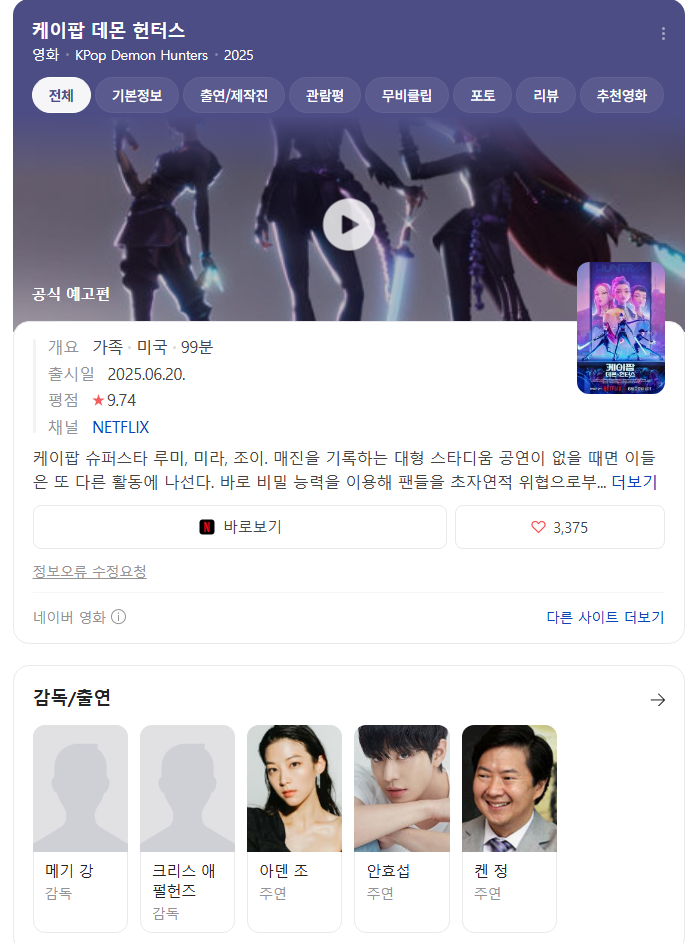 애니메이션 영화인데 뮤지컬느낌이 나는 그런 애니메이션이다. 나는 스토리와 내용들이 중요하다고 생각하고 음악은 도와주는 역할인게 좋아서 뮤지컬영화는 너무 별내용없고 음악이 메인이라 그렇게 선호하는 장르는 아닌데 유투브에 맨날 쇼츠랑 이런게 올라오고 지금 넷플 흥행중이라 봤다.