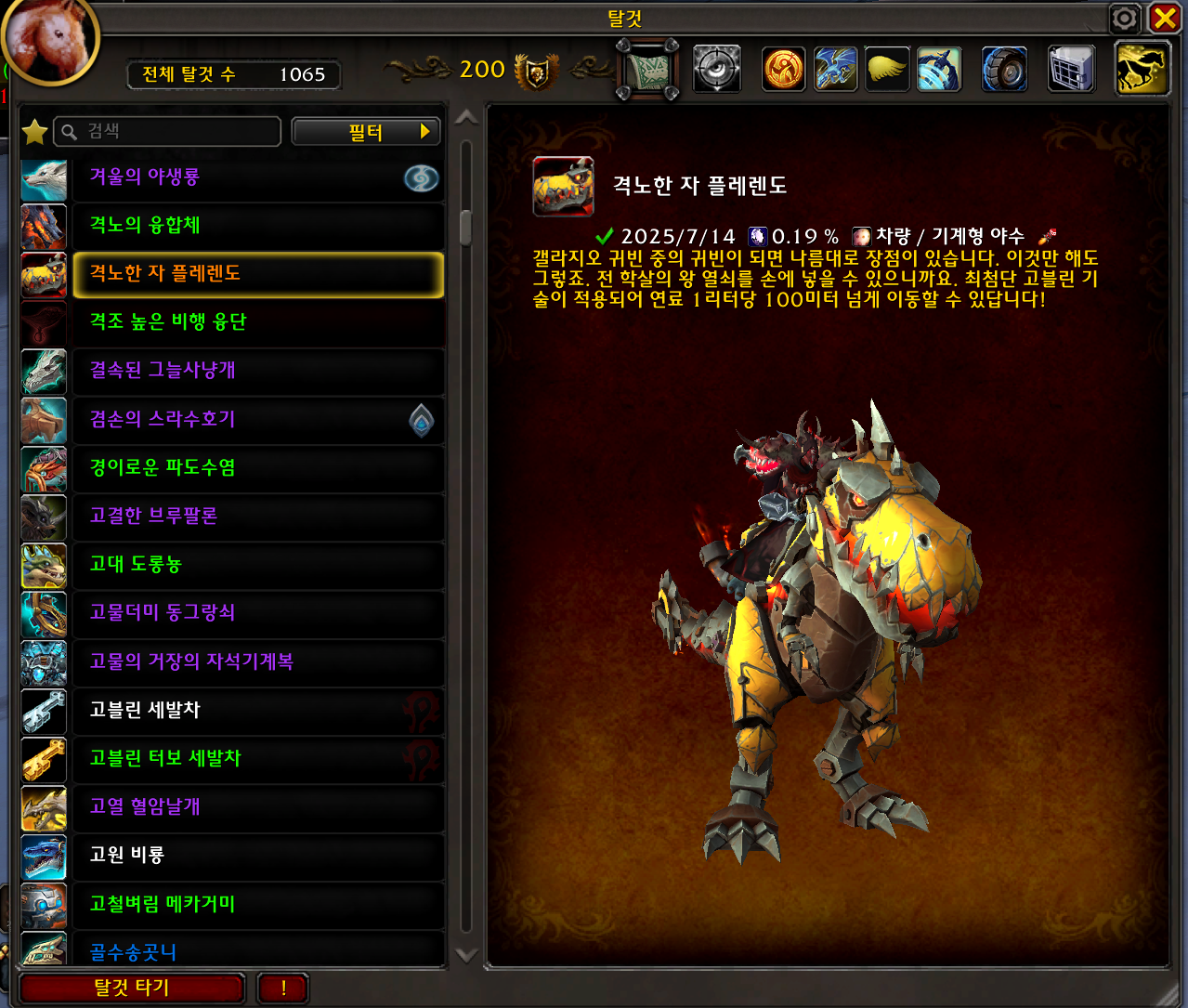 2025.07.14 격노한 자 플레렌도 획득 1065번째 탈것