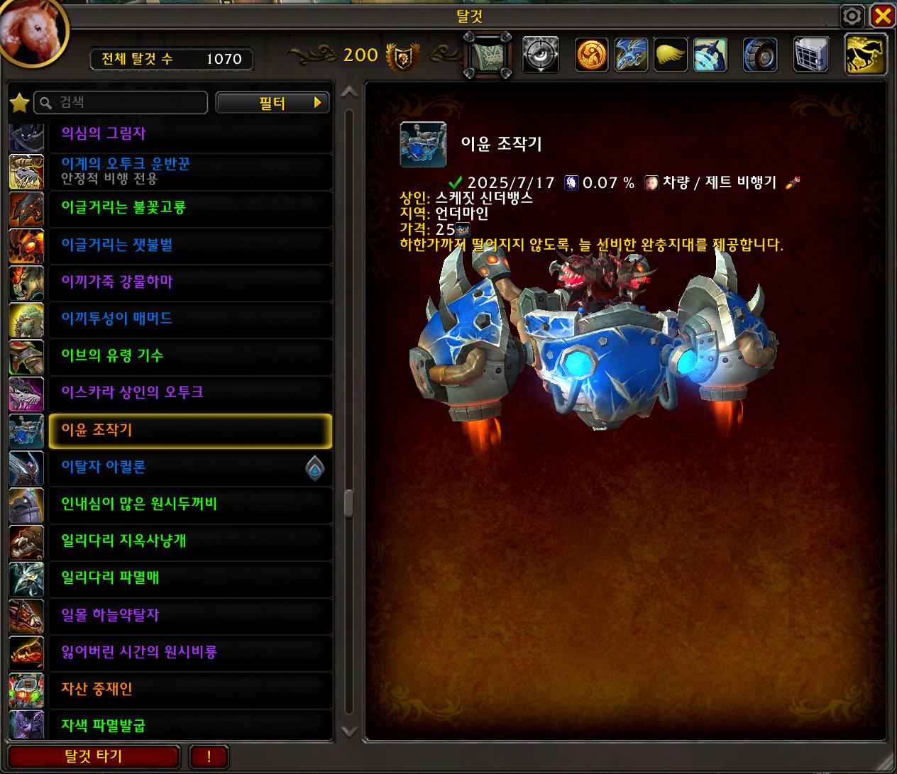 2025.07.17 이윤 조작기 획득 1070번째 탈것