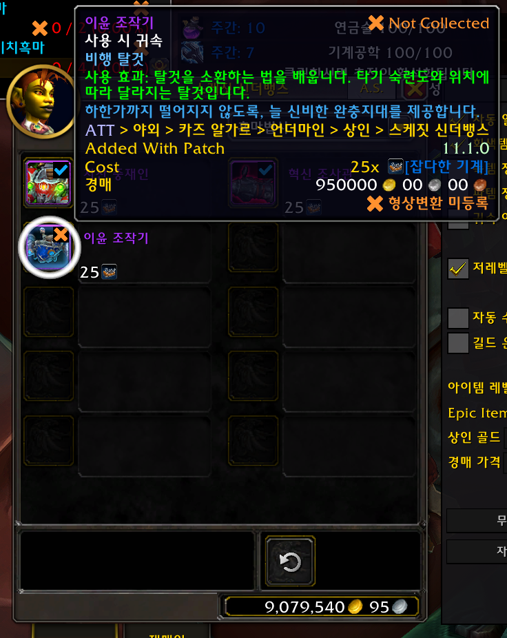 이윤 조작기 탈것은 내부전쟁 확장팩 탈것으로 잡다한 기계로 구매하는 탈것입니다.