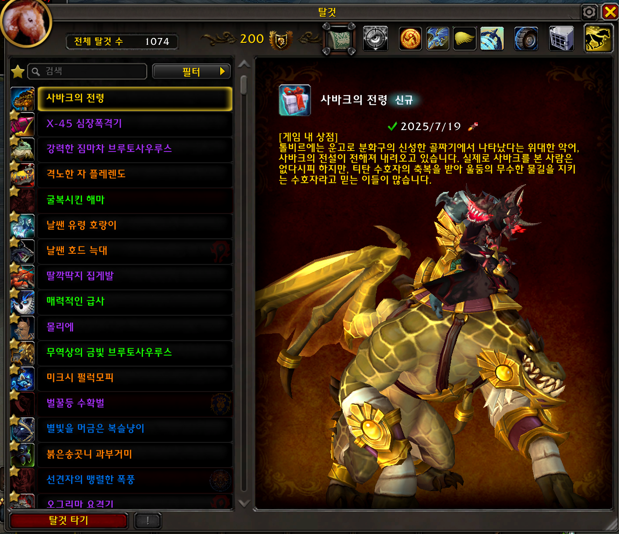 2025.07.19 사바크의 전령 획득 1074번째 탈것