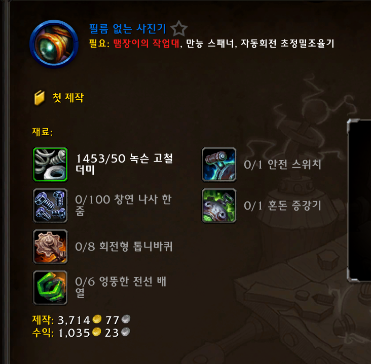 녹슨 고철 더미 50개 / 창연 나사 한줌 100개 / 회전형 톱니바퀴 8개 / 엉뚱한 전선 배열 6개 / 혼돈 증강기 1개 / 안전 스위치 1개 입니다.