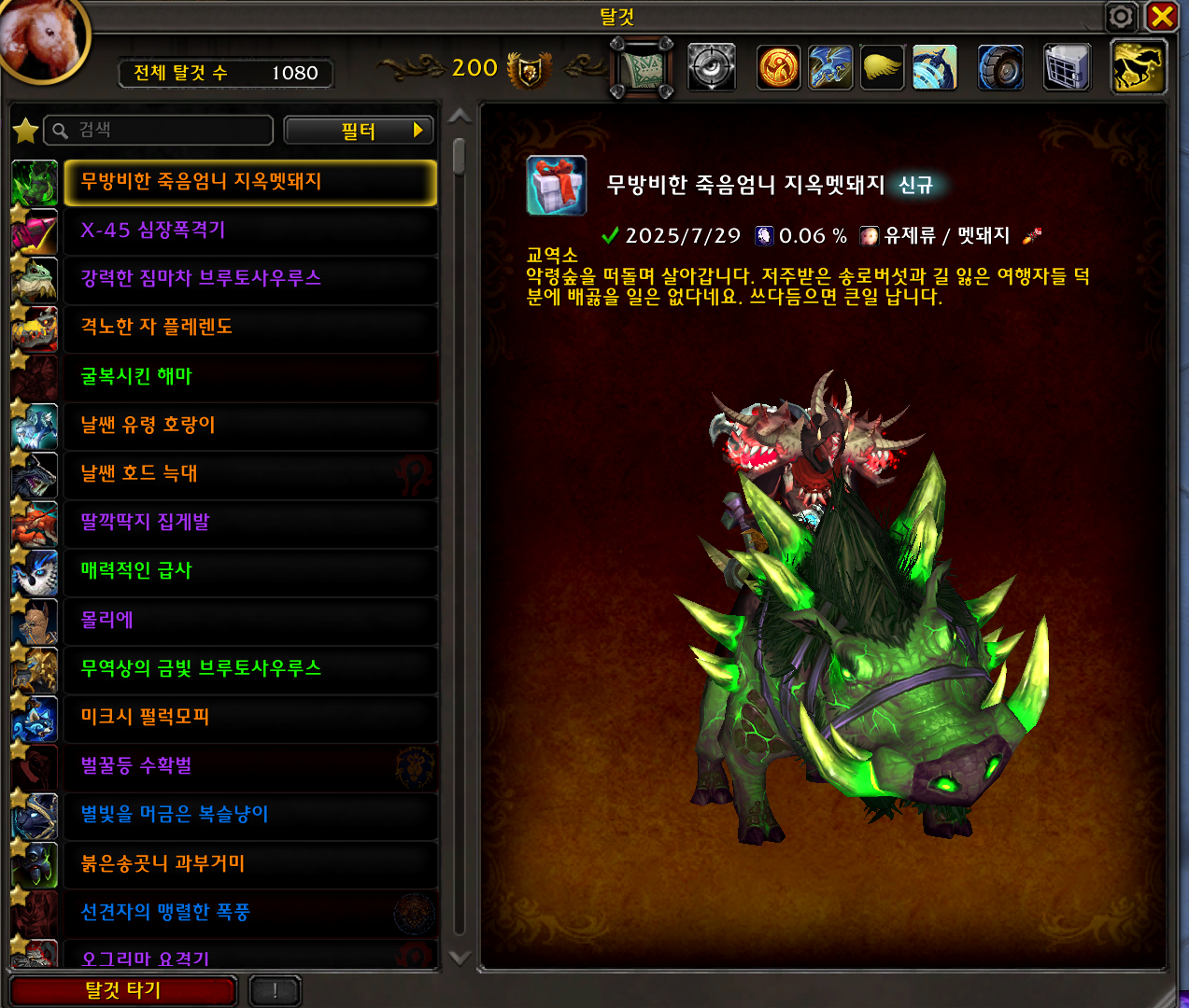 2025.07.29 무방비한 죽음엄니 지옥멧돼지 획득 1080번째 탈것