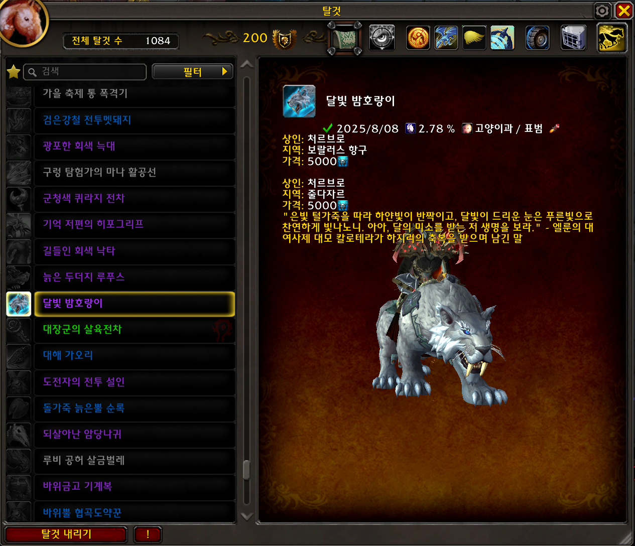 2025.08.08 달빛 밤호랑이 획득 1084번째 탈것