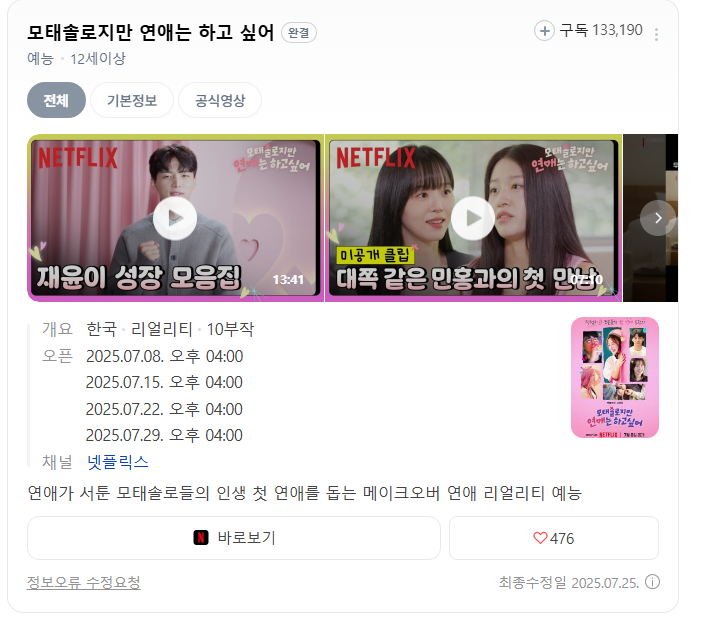 처음에는 진짜 모태솔로일까? 유명해지고 싶어서 나온걸까 하는 의문이 조금은 있었는데 보면서 점점 출연자들을 응원하게 되고 제작진들이 정말 모태솔로 12명을 잘뽑았다는 생각이 들었다.